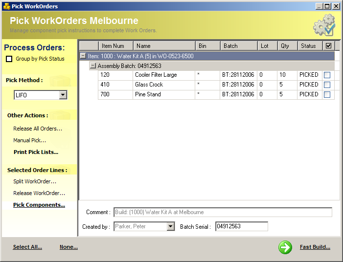 The Stock Picking system within the WMS allows multiple Work Orders to be Picked at the same time. In this example a single Work Order is selected.
