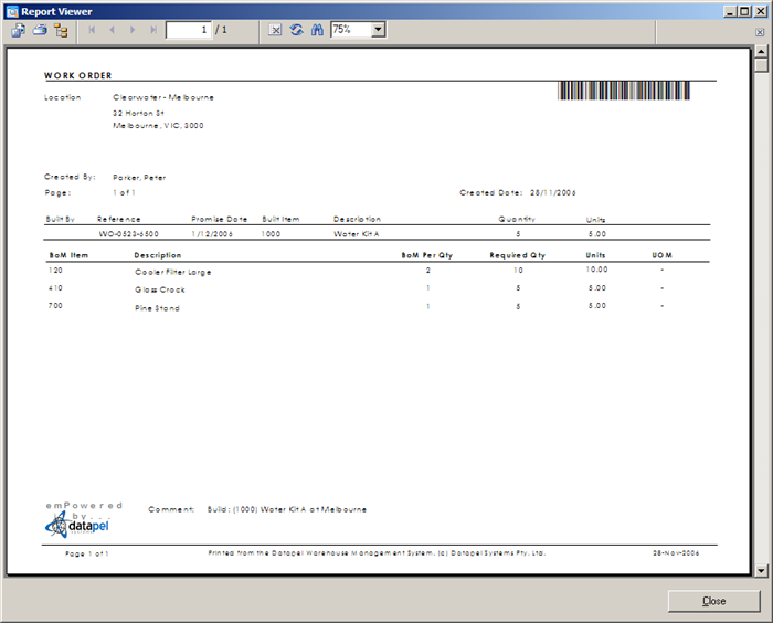 Once the Work Order is picked and built, the paper work is returned to the Warehouse Manager who confirms the Work Order and clears it through the MYOB Premier accounting system.