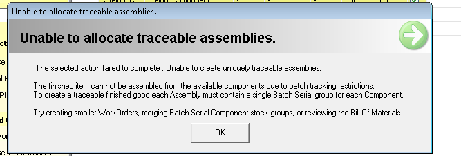 In this example, click Select All then Pick Components. In the previous screen shot stock batch BT-28112006 was allocated to the Work Order. It is possible to adjust the selection using the Manual Pick.