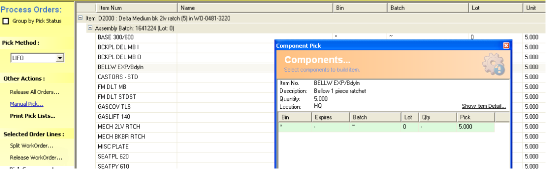 Workflow Reminder Please note that WorkOrder must be BUILT before the user can use the manual pick method. |