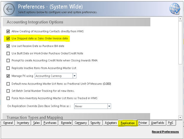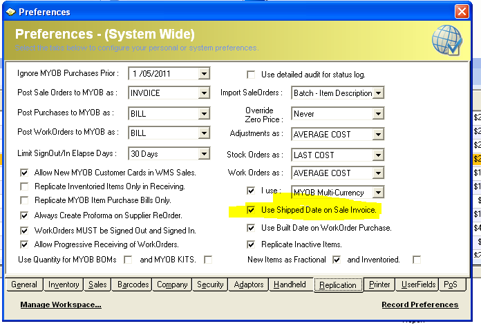 2. When checked, WMS Shipped date is applied as the Order date/Invoice date in MYOB, when unchecked the WMS Order Date is applied as the Order date/Invoice date in MYOB