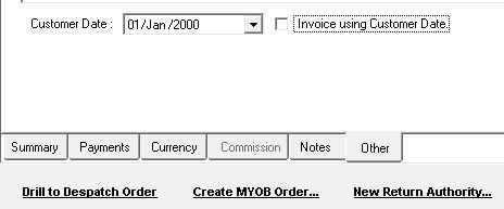 3. In addition, each sale order has an override Invoice Date Function "Customer Date". Check the box and select a date to force this date as the Order date/Invoice date in MYOB.
