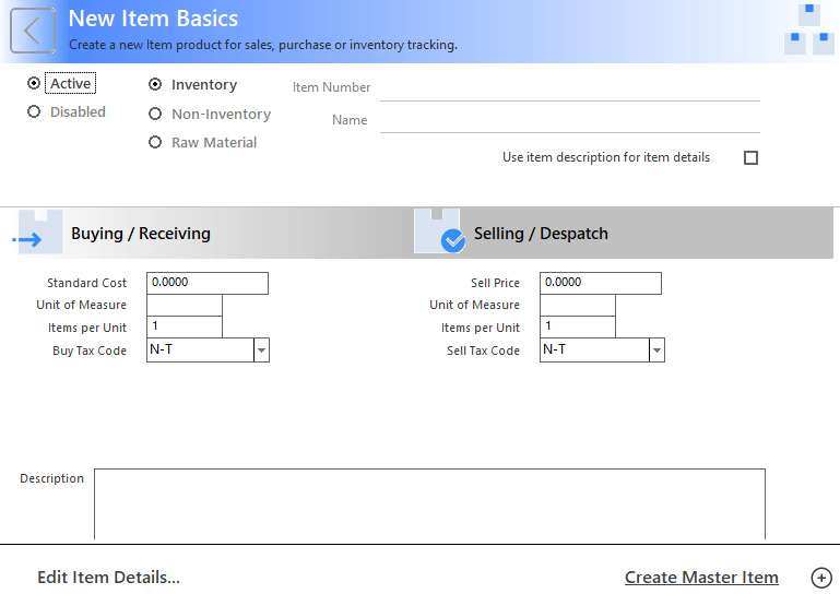 Review all entries for accuracy. Once confirmed, click Save. The item is now ready for stock adjustments, purchasing, or sales orders.